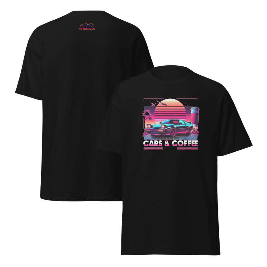 A unique RetroWave Cars & Coffee design exclusive to TH Detailing Ltd featuring Cars, Coffee, Sunsets & Futuristic planes.